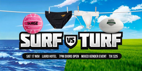 Supported by Thorne Harbour Health (formerly VAC) and partnered with The Laird Hotel, the Melbourne Chargers and Melbourne Surge present “Surf vs Turf”. Two of Melbourne’s gay and inclusive sport teams, rugby union and water polo, face off in the ultimate pub-olympics - a battle of brains, brawn and beauty to determine the ultimate supremacy: Surf or Turf. Doors kick open at 7pm on Sat 17 November at the Laird Hotel. First round at 9pm. This is a mixed and all gender-inclusive event! Tickets are only $20 online with proceeds to support the Melbourne Chargers Rugby & Melbourne Surge Water Polo Clubs. There will be door prizes, a raffle and much more! This is an event not to miss! Tickets available on the door for $25.